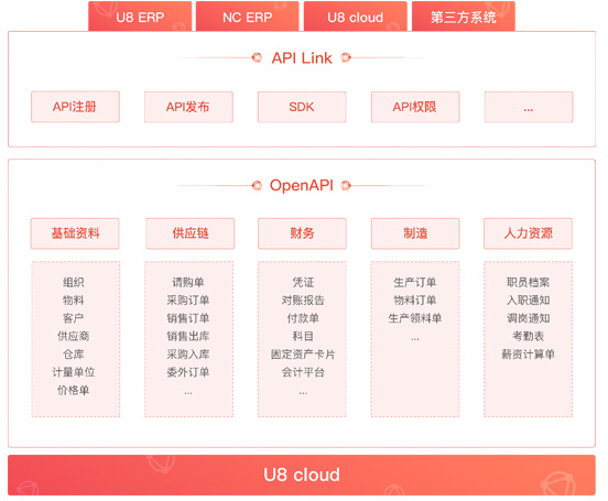 OpenAPI融合创新 U8 cloud OpenAPI是基于用友U8 cloud企业用户和U8 cloud的开放接口,接入外部合作伙伴,为企业用户提供丰富应用和完善服务的开放平台。平台采用“云+端”的形式满足企业用户实现云ERP和云服务对接的要求。
