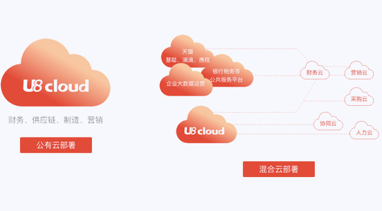 全面支持云部署 公有云部署:云应用和ERP业务均部署在公有云,这种模式使用成本较低,数据保护方面也比较有保证,且方便扩展云服务 混合云部署:云应用部署在云端,企业ERP部署在企业内部,相互独立,但在云的内部又相互连通,可以发挥出各自的优势。